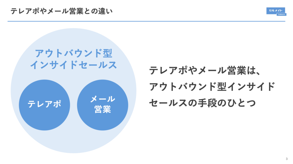 つまり、テレアポやメール営業はアウトバウンド型インサイドセールスの手段のひとつだということです。