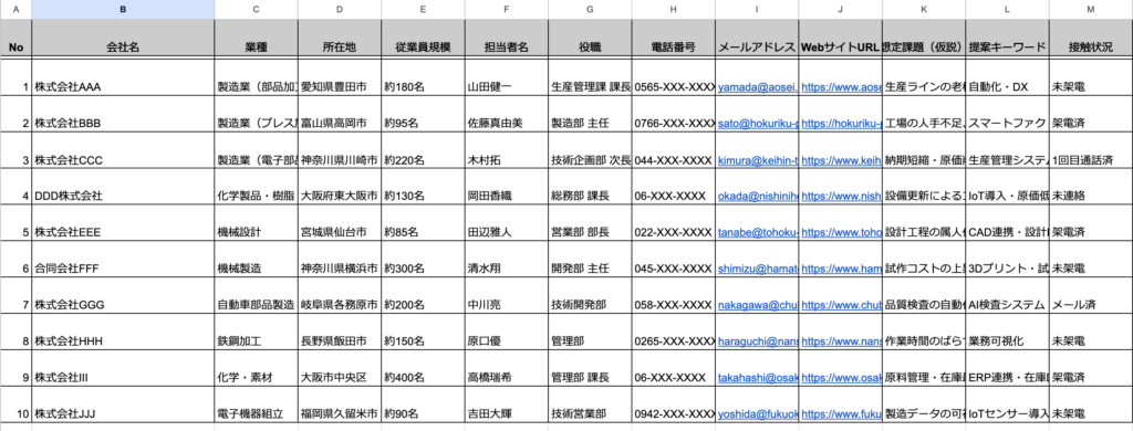 を明確にし、それに当てはまる企業をリスト化していきましょう。下記はスプレッドシートで実際にまとめた際の例です。