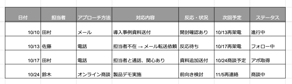 このとき、いつ誰がどの手段で連絡し、どのような反応があったのかを逐一入力しておくことで、チーム全体での連携がスムーズになります。たとえば、次のようにスプレッドシートを活用すると、視覚的にも状況を把握しやすくなります。