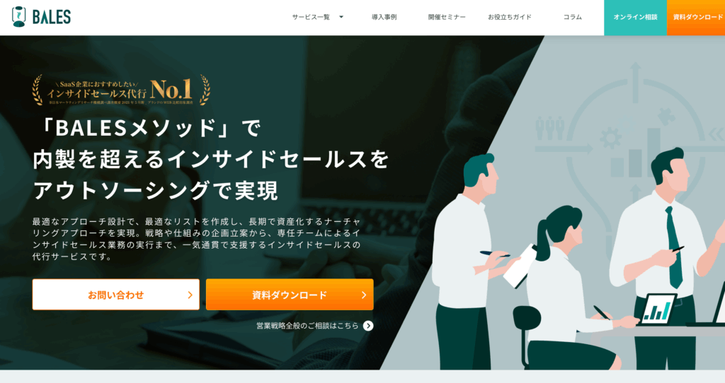 BALESは、SmartCamp社の「BALES」はSaaS企業の営業プロセス最適化を支援するアウトソーシングサービスです。累計350件以上のプロジェクト経験で培った知見から営業プロセスの可視化・型化を行い、再現性のあるインサイドセールス組織づくりを支援する点に強みがあります。