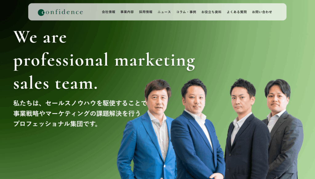 コンフィデンスは、1,050社以上の導入実績を持つ営業支援のプロ集団です。マーケティング戦略の実行支援からインサイドセールス代行まで一気通貫で行い、テレアポ代行・リードナーチャリング・MA導入支援など営業プロセスのあらゆる場面に対応します。