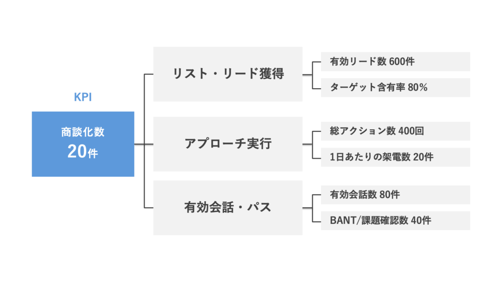 例えばバックオフィス系SaaSのBDRを想定し、KGIを「月20件の商談創出」と置いた場合、以下のようなKPIツリーが作成できます。