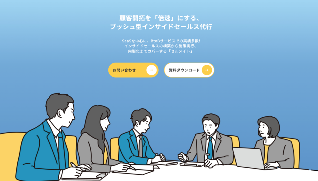 プッシュ型インサイドセールス代行サービス「セルメイト」は、BtoB企業向けにアウトバウンド型のインサイドセールス構築・運用を支援。SaaS企業をはじめ多くの企業での支援実績があり、リード獲得から商談創出までをワンストップで代行します。
