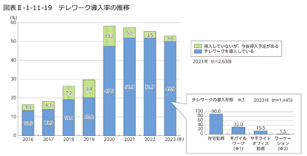 総務省の調査によれば2023年時点でテレワークを導入している企業は約5割に達し、大企業を中心に多くの企業でリモート業務が定着。これにより社内外のコミュニケーションや業務管理の手段としてSaaS製品の需要が高まっているのです。