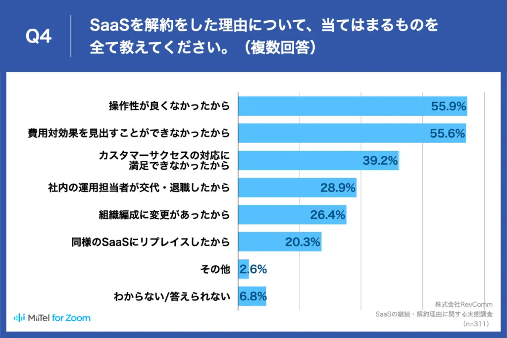 実際にPRTIMESの調査によると、「SaaSを解約した理由」の40%が「導入後の対応(サポート)に満足できなかった」点に起因するとの結果が報告されています。