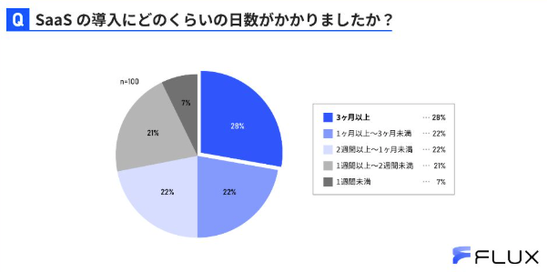 実際、株式会社FLUXの調査では、「SaaS導入完了までに3か月以上かかった」とする企業が28%、「1~3か月未満」が22%に上り、1か月未満で完了した企業はわずか約半数に留まりました。