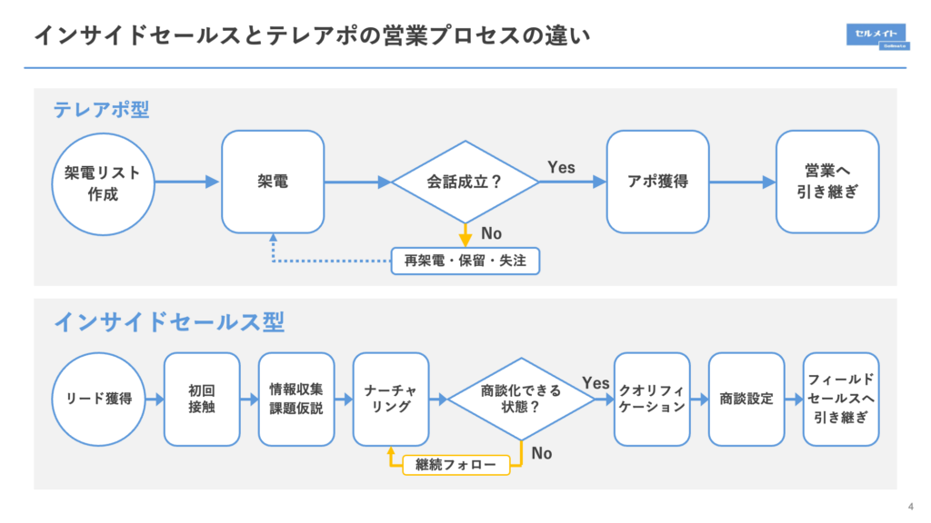 テレアポは「リスト作成→架電→アポ獲得→営業担当へ引き継ぎ」という線形に寄りやすいのが特徴です。主な違いは以下の図を参考にしてください。