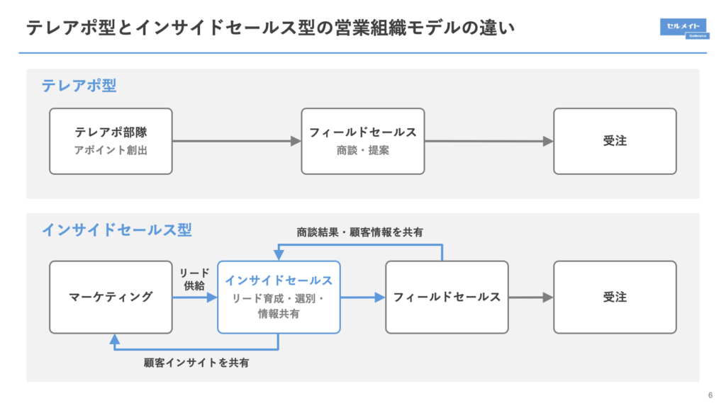 つまり、テレアポがアポイント創出に特化した独立部隊であるのに対し、インサイドセールスは部門を横断して情報と成果をつなぐ戦略的ポジションといえるでしょう。営業体制を設計する際は、「どの役割を担わせたいのか」という視点で両者を捉えることが重要です。